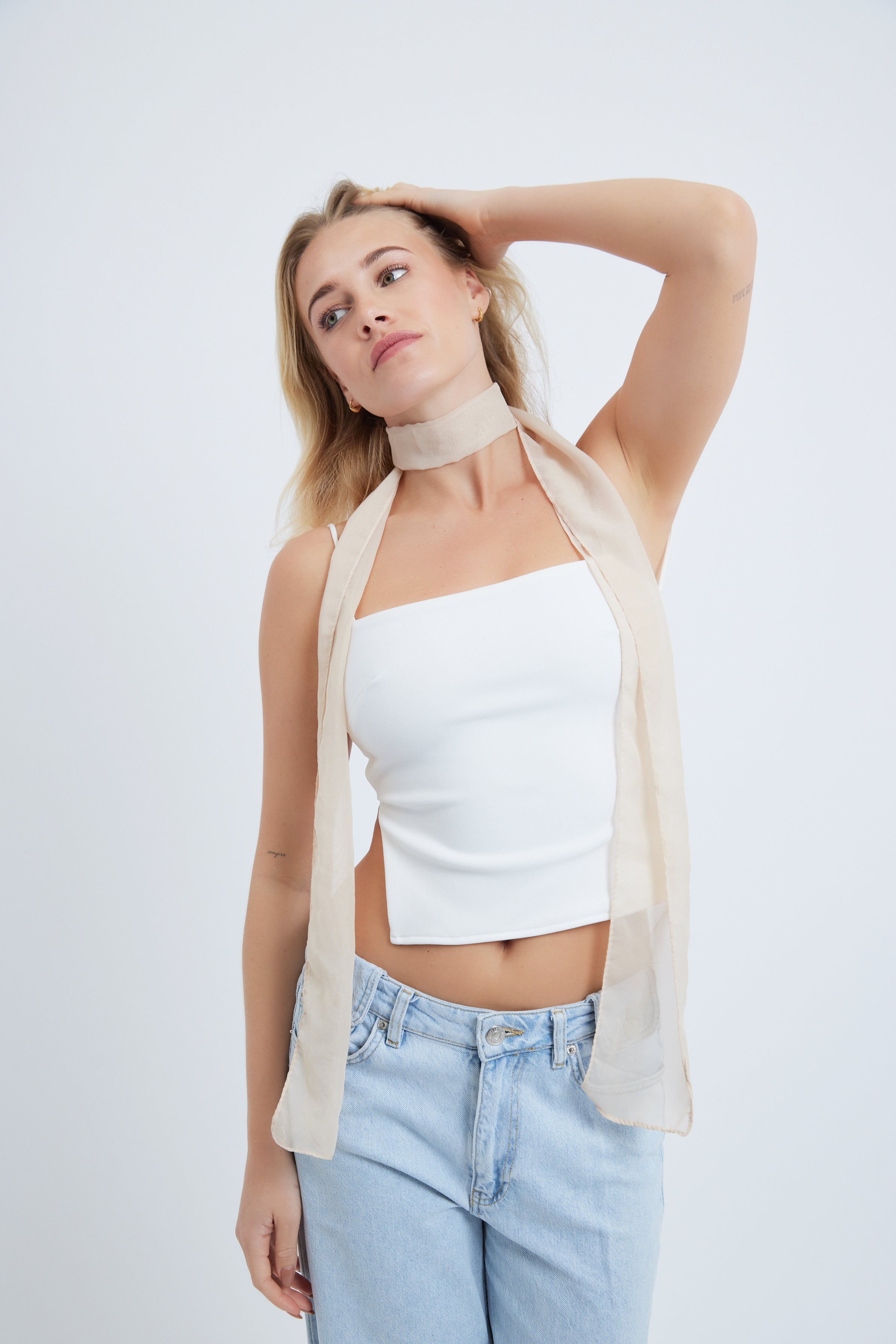 Elevate your look with the subtle sophistication of our Chiffon Skinny Scarf in Cream. Whether worn as a necktie, hair accessory, or belt, this versatile scarf adds a touch of elegance to any outfit with its timeless design and luxurious feel.