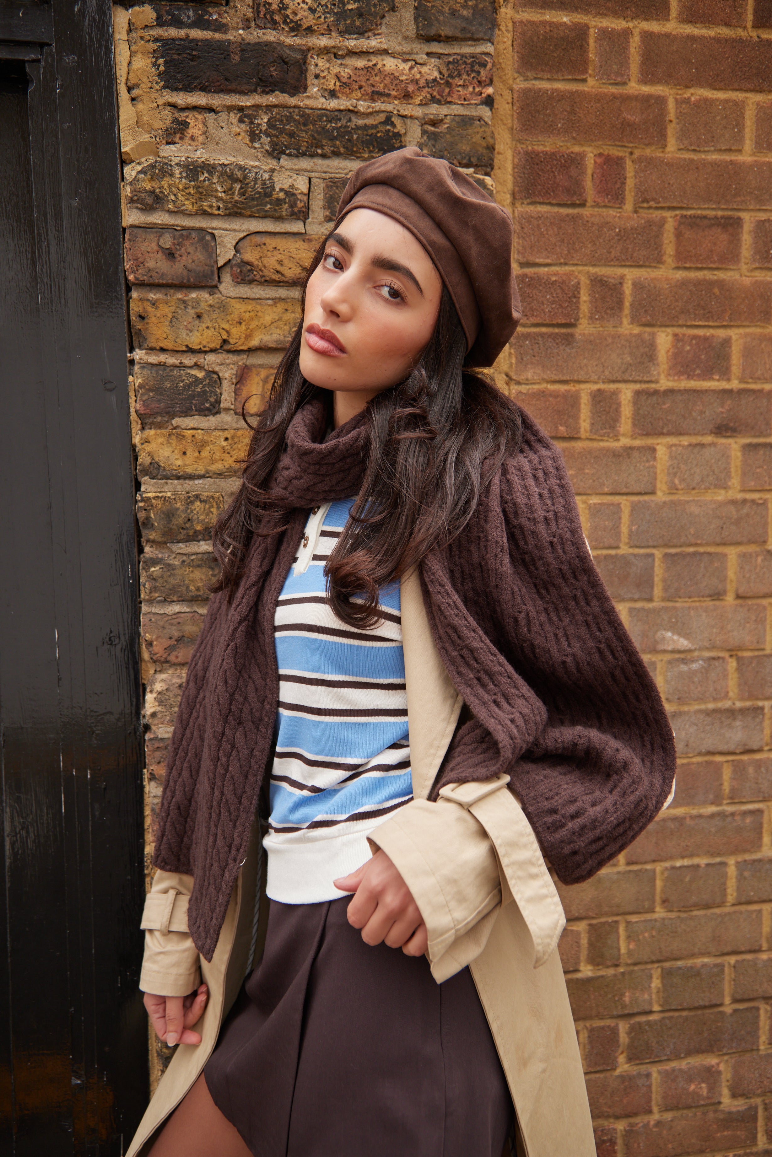 Stay cosy and stylish with our retro inspired cable knitted scarf. Made from a soft, chunky knit with a classic cable design, this timeless scarf is the perfect blend of warmth and style. The rich chocolate tort brown colour makes it a standout winter accessory, while the versatile design means it can be paired with everything from casual coats to smarter outerwear.